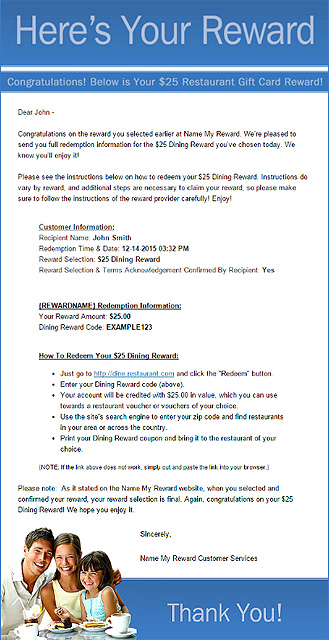 After you've redeemed your Name My Reward reward code, you'll be taken to the reward review and selection page. As you'll see, you have many rewards to choose from. We’ll share with you information about each one, like an overview of the reward, and the provider's terms and conditions for the reward. This is so you can make the best possible decision. Then you simply decide which reward you want most. Name My Reward will then email you your reward, and all the information you’ll need to redeem it with the reward provider. It’s that easy!